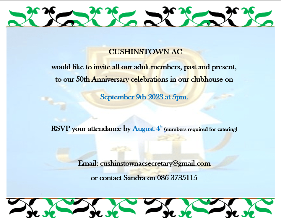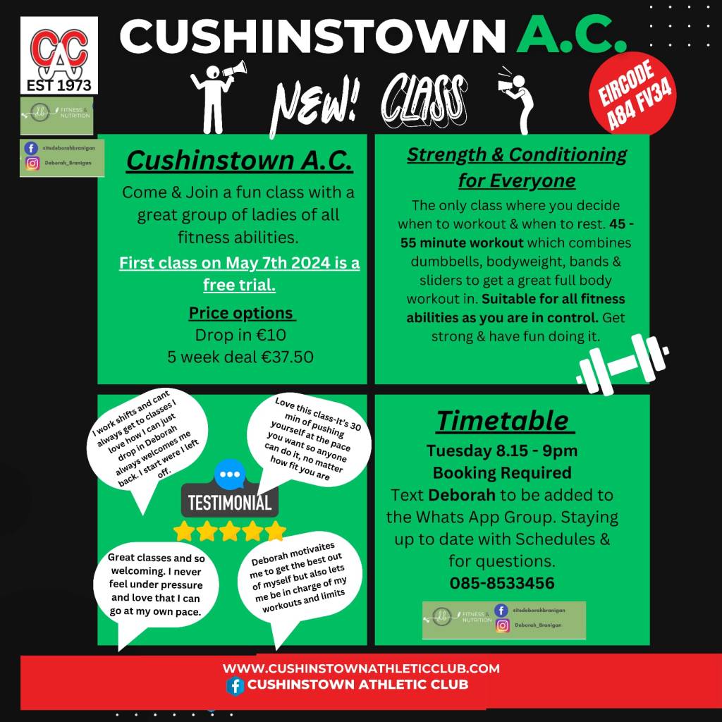 - First Class 7th May 2024 8:15-9pm in Cushinstown A.C. (This class will be a free trial to see if you would like to sign up for weekly session)